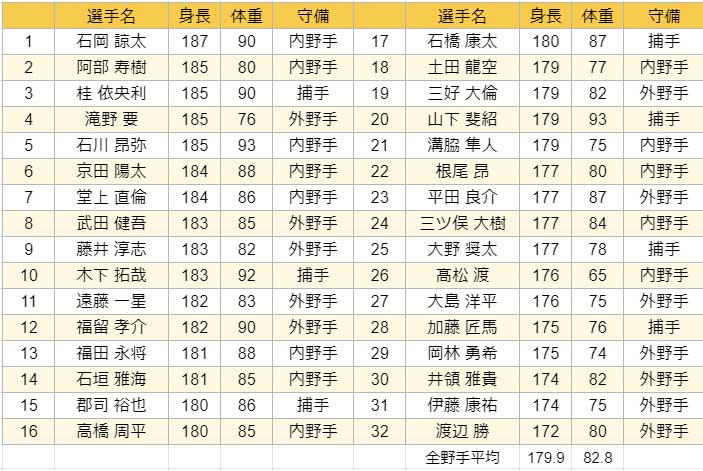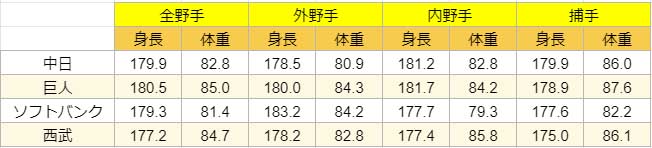 各チームの選手の体格はこちら
